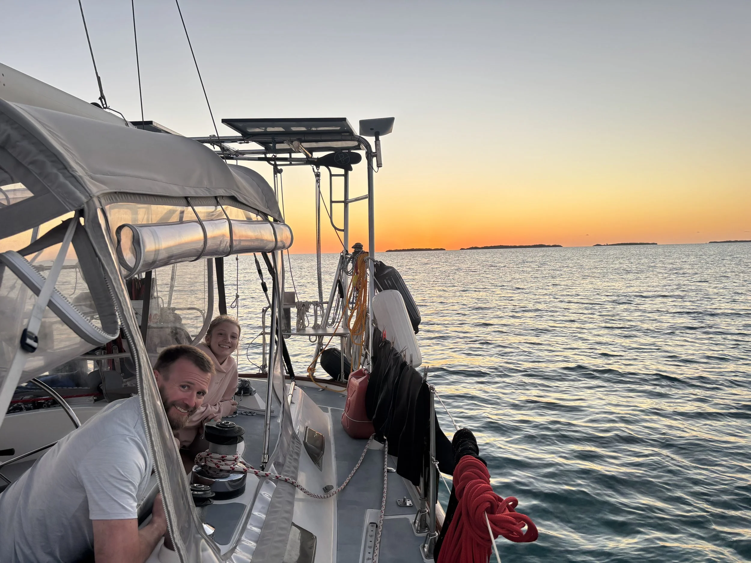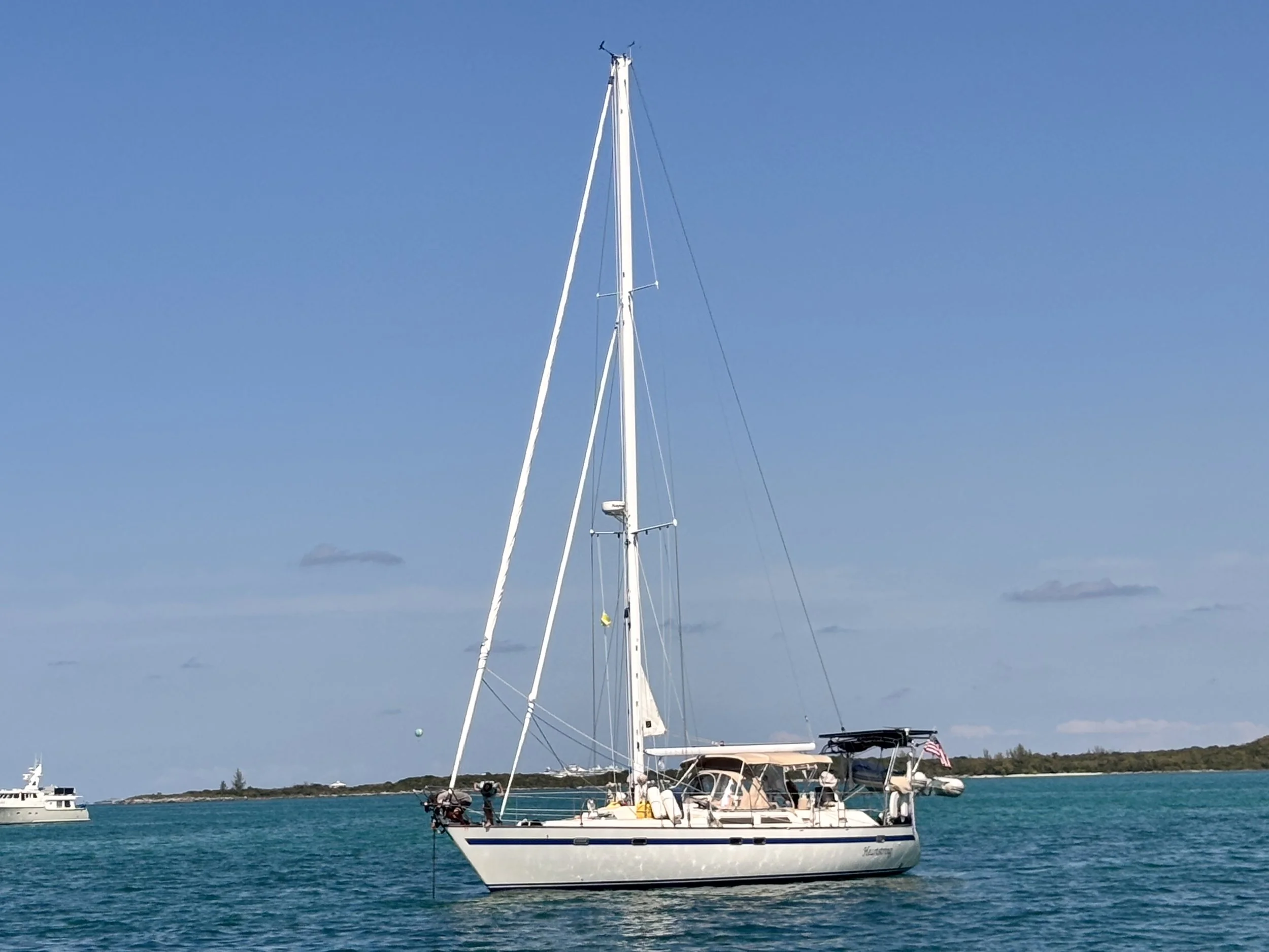 While anchored in West Palm waiting for a weather window to cross, we met the owners of another Taswell 43 named Heartstring. Scott, his wife Jennifer, and their eleven-year-old daughter Alyssa were making their first crossing to the Bahamas, so we decided to buddy boat and cross together. When we finally got a good weather window, the two sister ships sailed 24 hours nonstop from West Palm Beach to Great Harbor Cay in the Berry Islands.