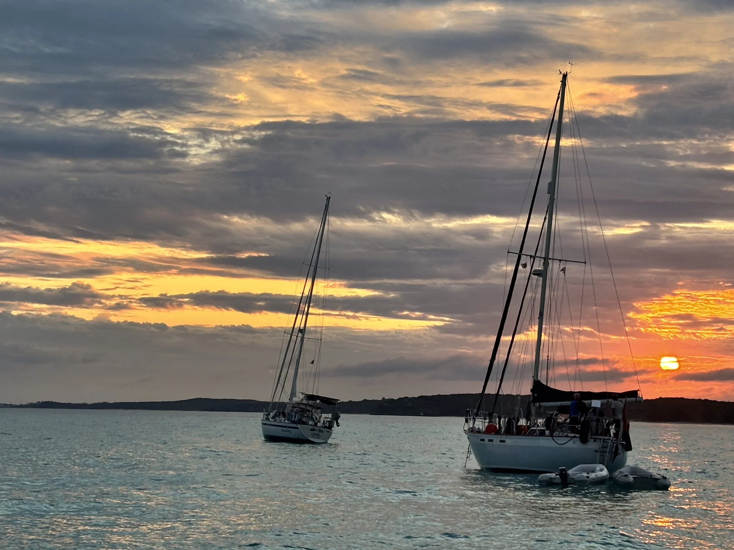 We departed the Berries one evening around sunset, bound for the Exumas. As we were leaving the anchorage, we noticed a fireball in the sky. We frequently checked for Starlink launches but saw nothing on the schedule, and for a while, we wondered if it was a meteor. Eventually, we realized we were watching a Starlink rocket explode, its fiery debris falling into the ocean.