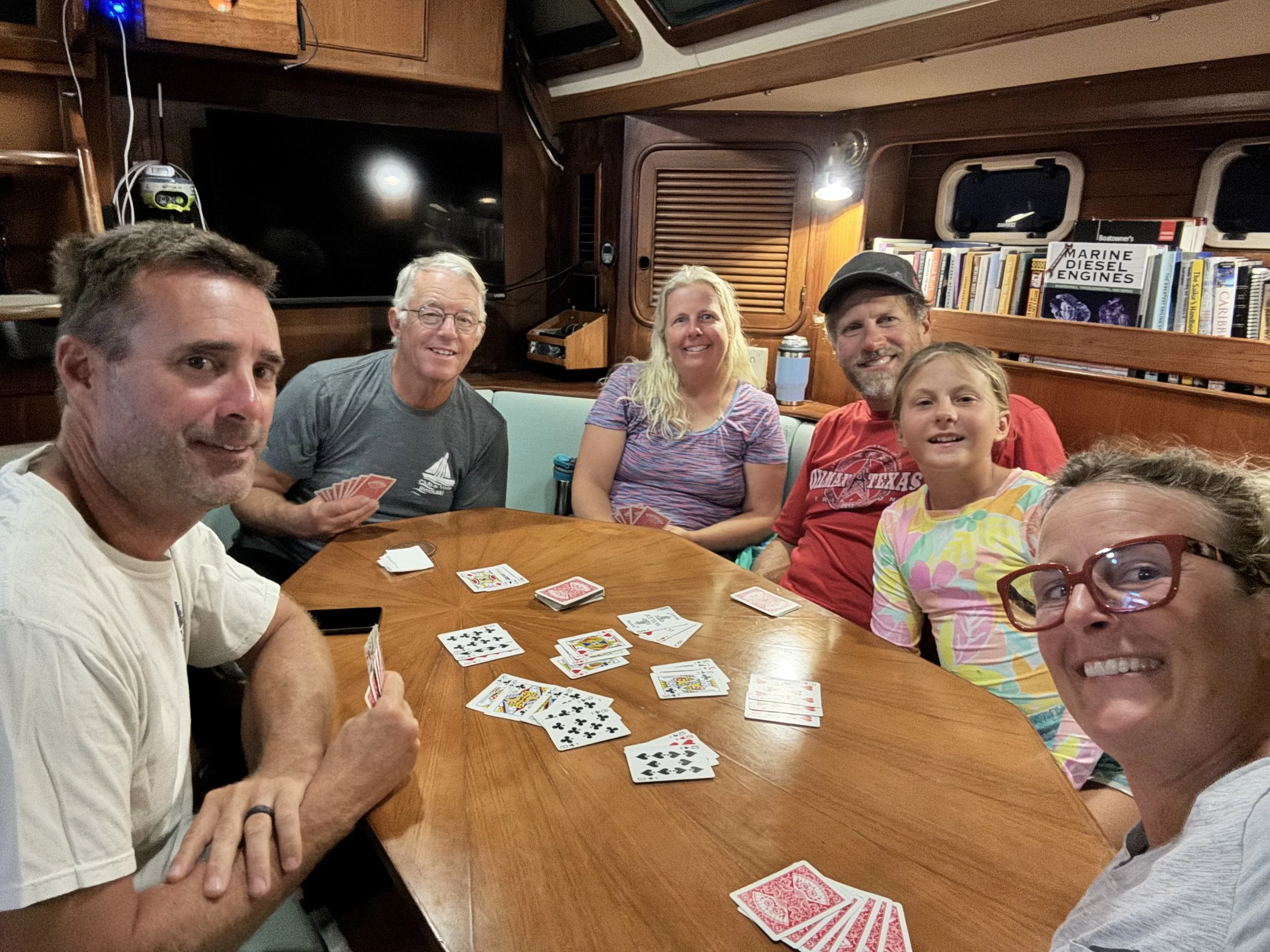 Left to Right: Ken, Ron (Old Hand), Jennifer, Scott, and Alyssa (Heartstring) and Me aboard Remedy for game night!
