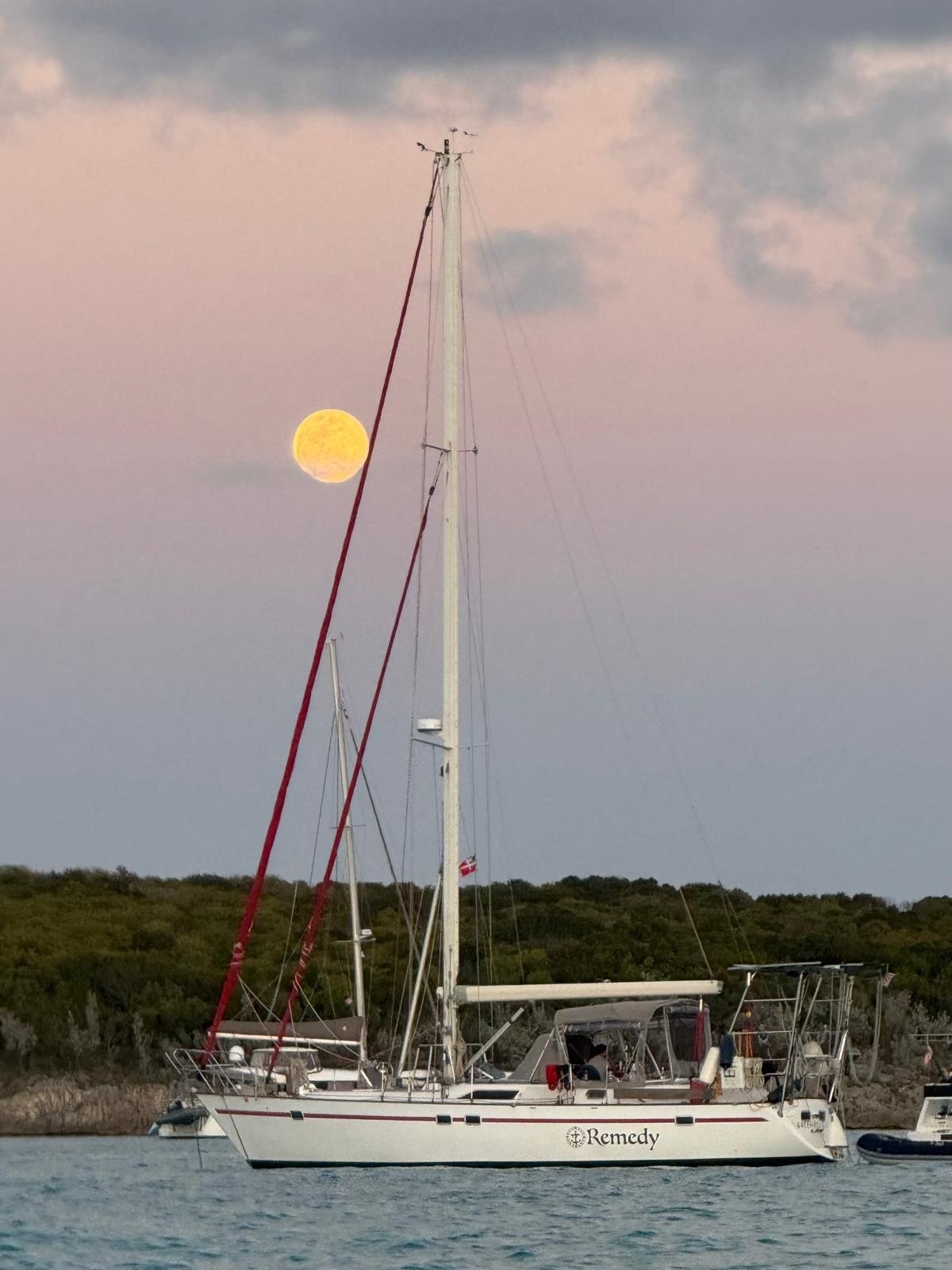Remedy out on anchor in front of the church on Cat Island on Easter morning.