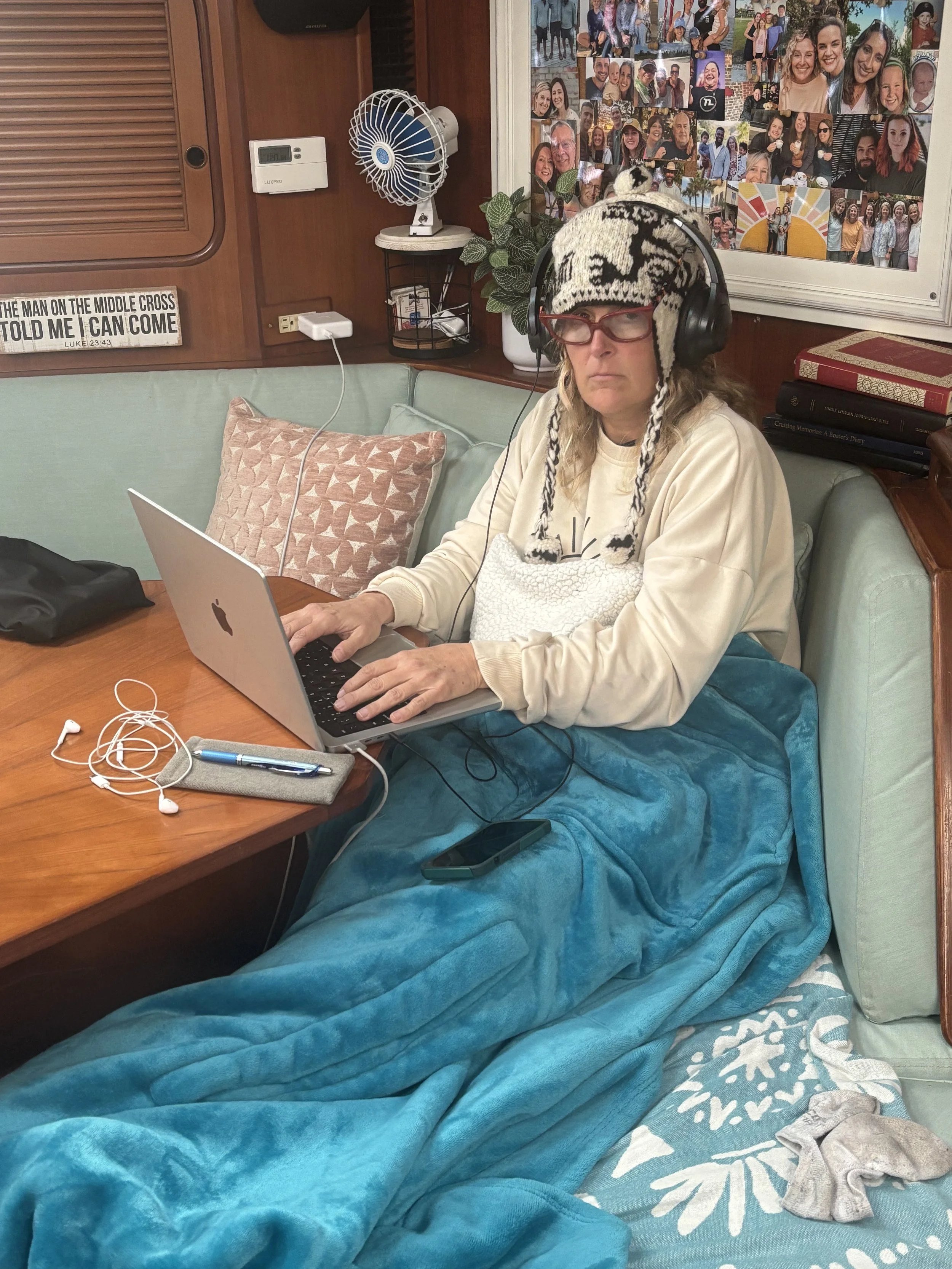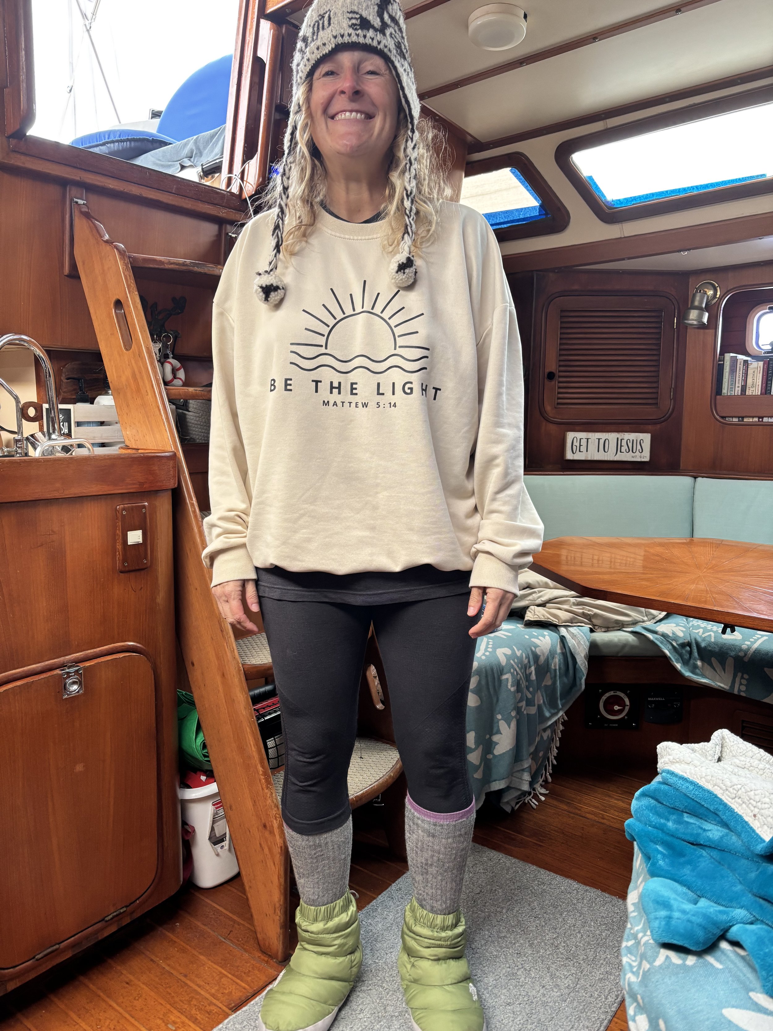 And this…We had no heat aboard when we started out in February, so we had to stay warm in whatever way possible.