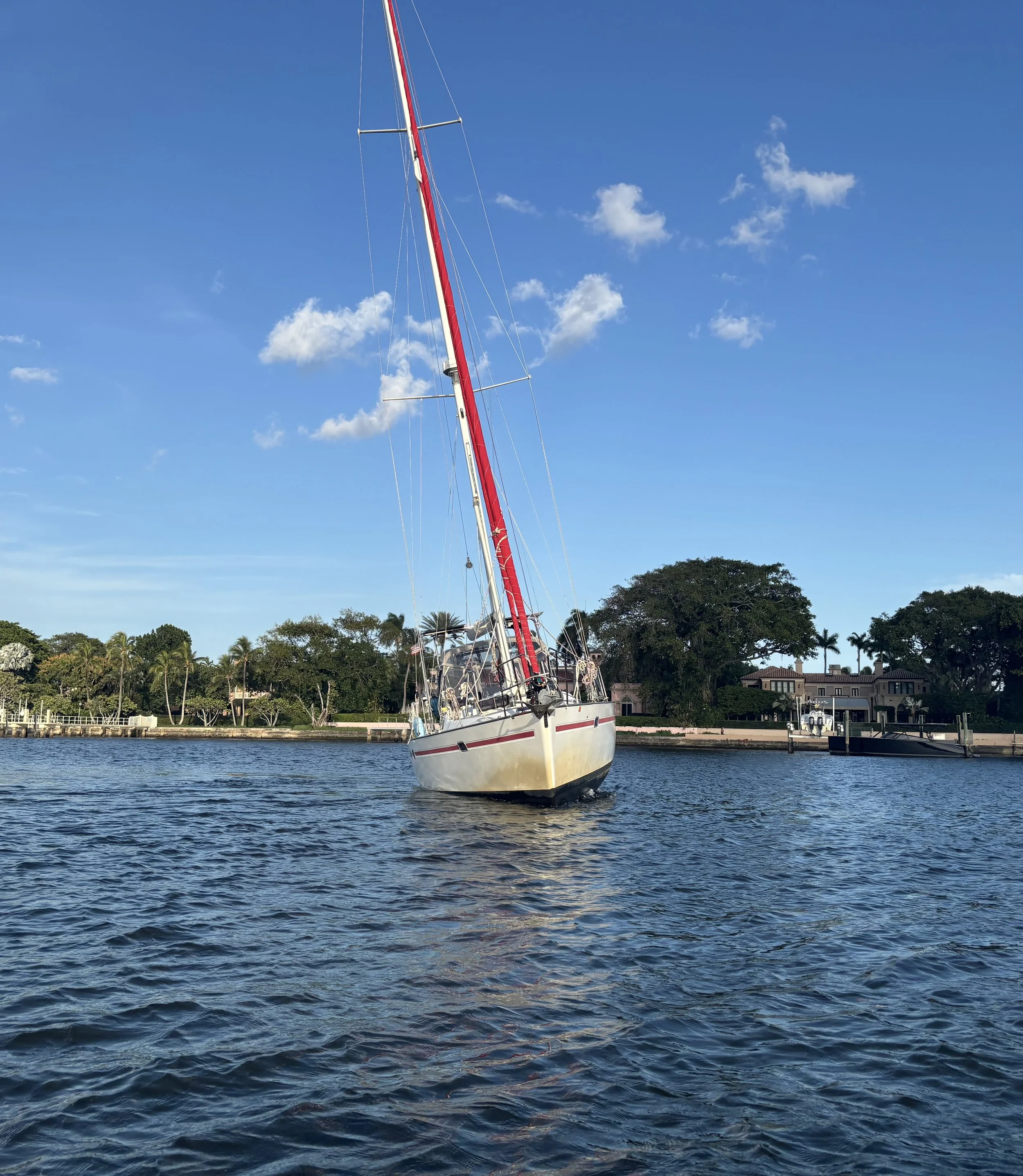 The next day, we sailed to Fernandina Beach, Florida, and then traveled via the Intracoastal Waterway to West Palm Beach, as there was no good weather window for sailing offshore for quite some time. We were excited to arrive back in West Palm and go ashore for a walk. As we were looking for a spot to anchor, however, we struck bottom on an unmarked object. After trying to pull ourselves free with a halyard and our dinghy, we resigned ourselves to waiting until the tide rose and floated us off. We spent several hours tilted at a 30-degree angle until around midnight, when we finally came free and found a new spot to anchor.