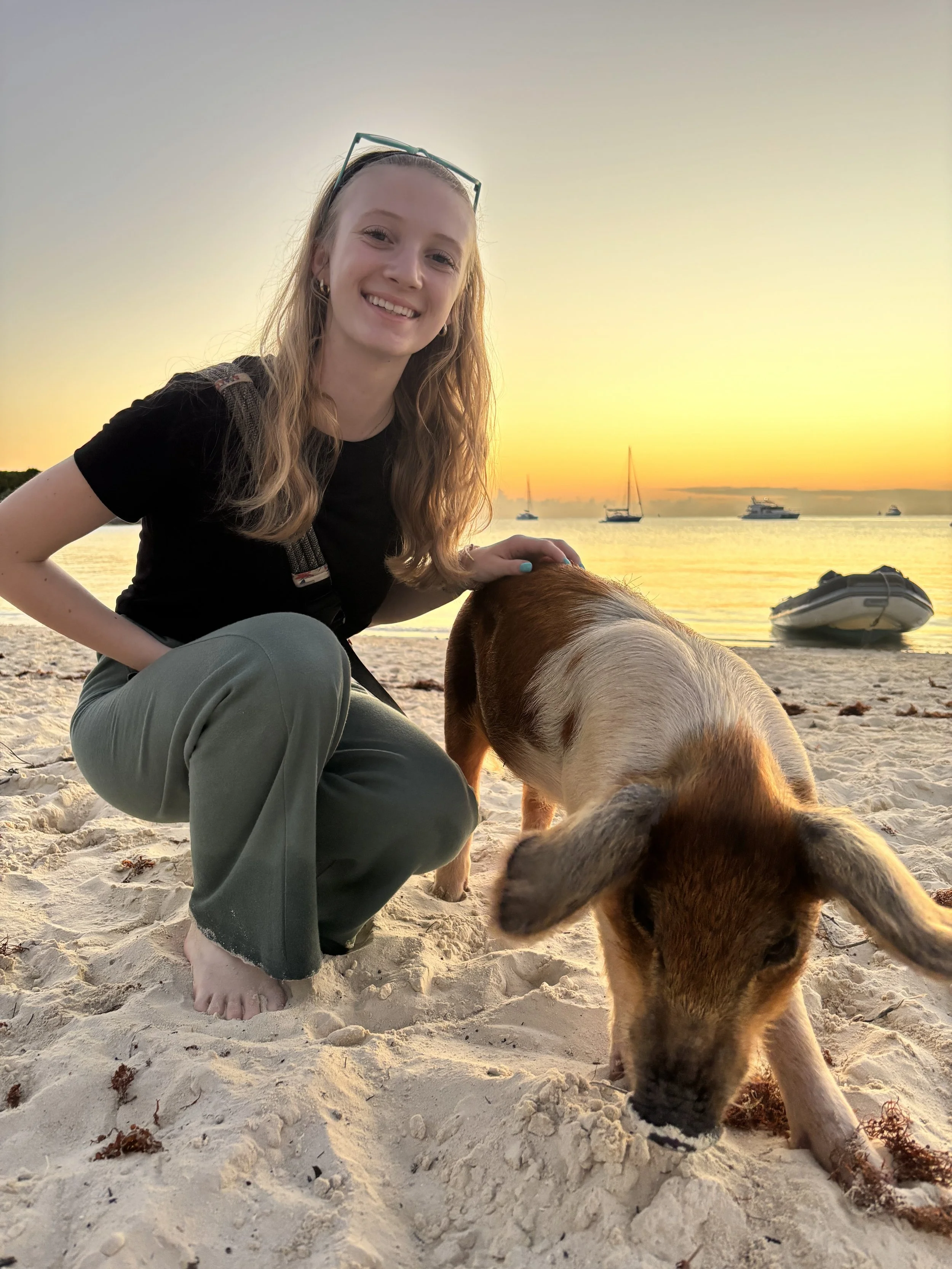 Claire with the pigs on Staniel Cay, Exumas