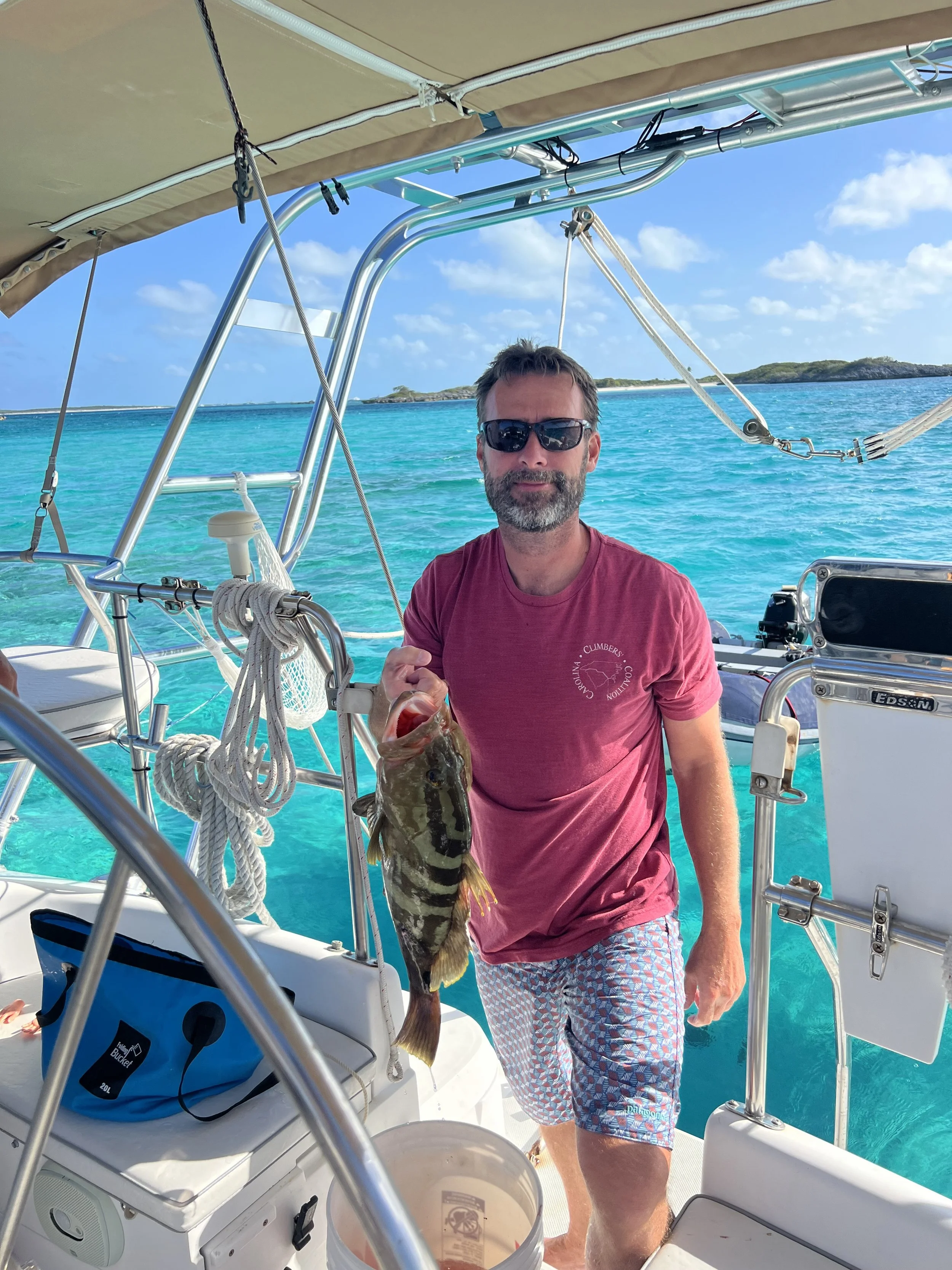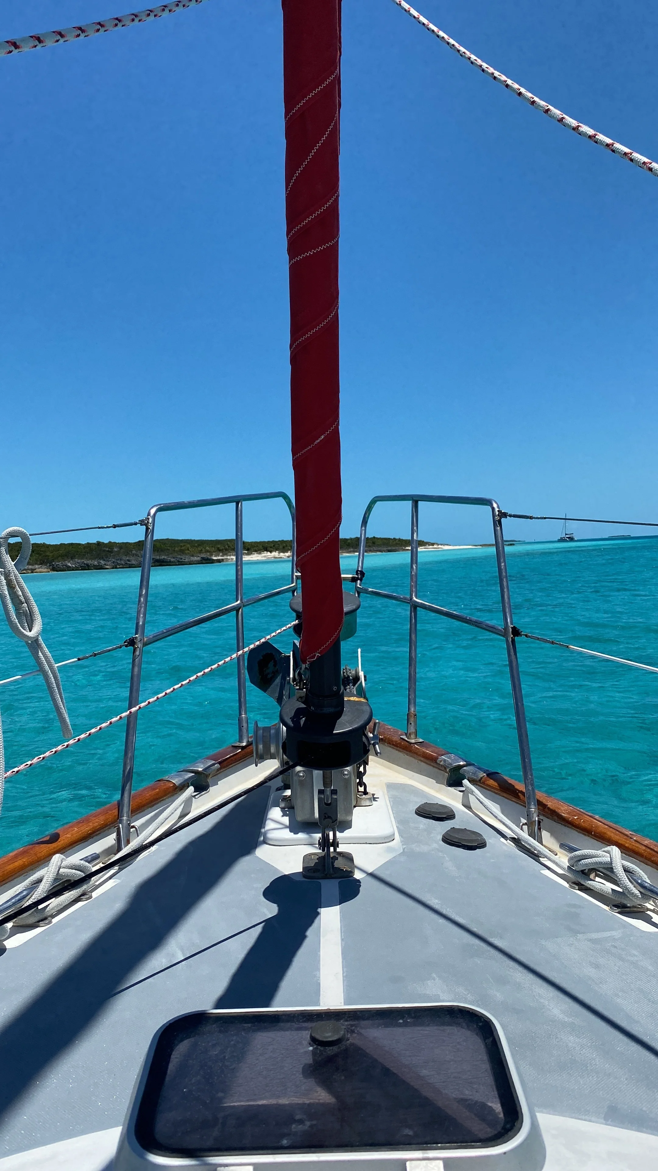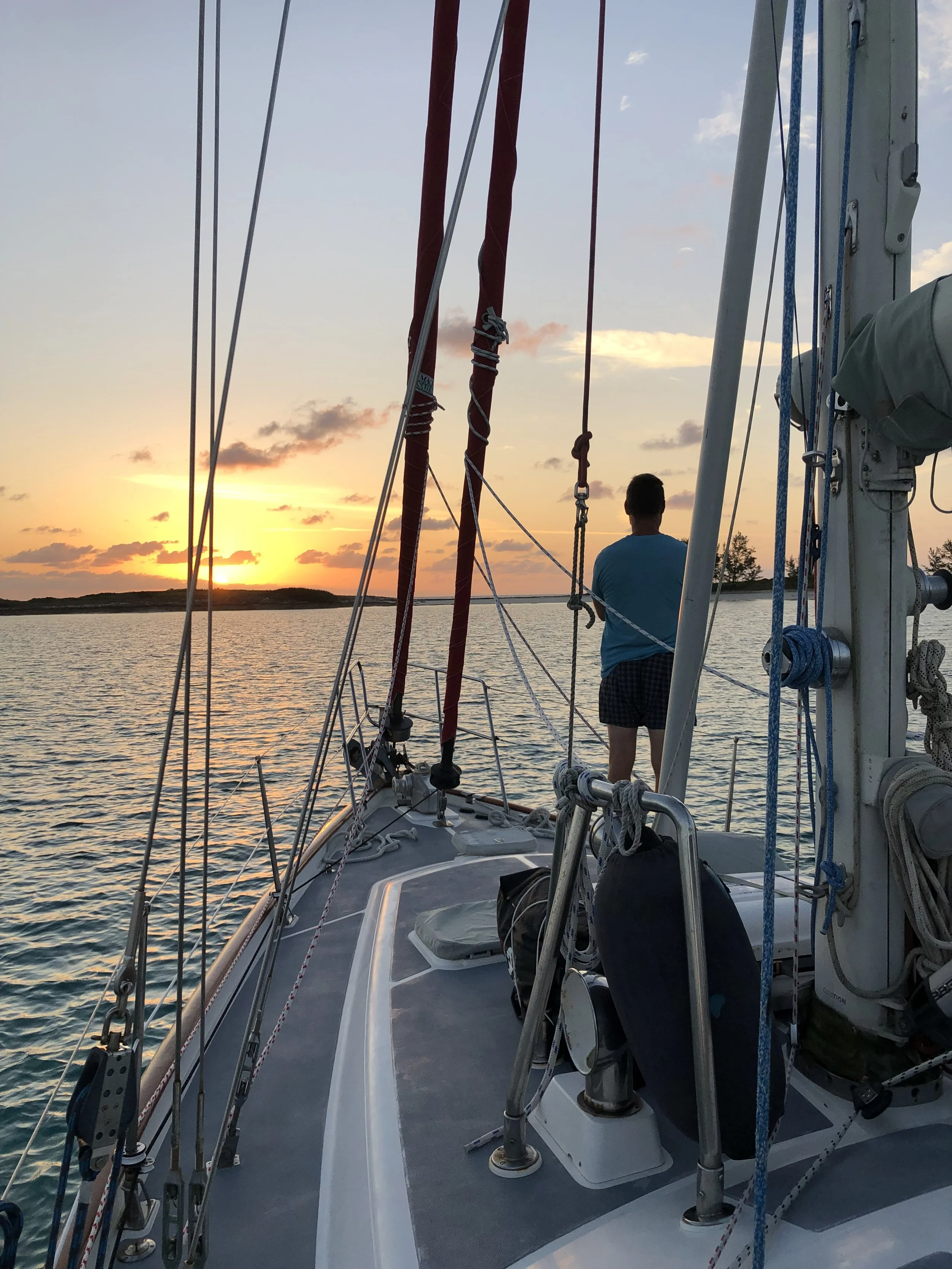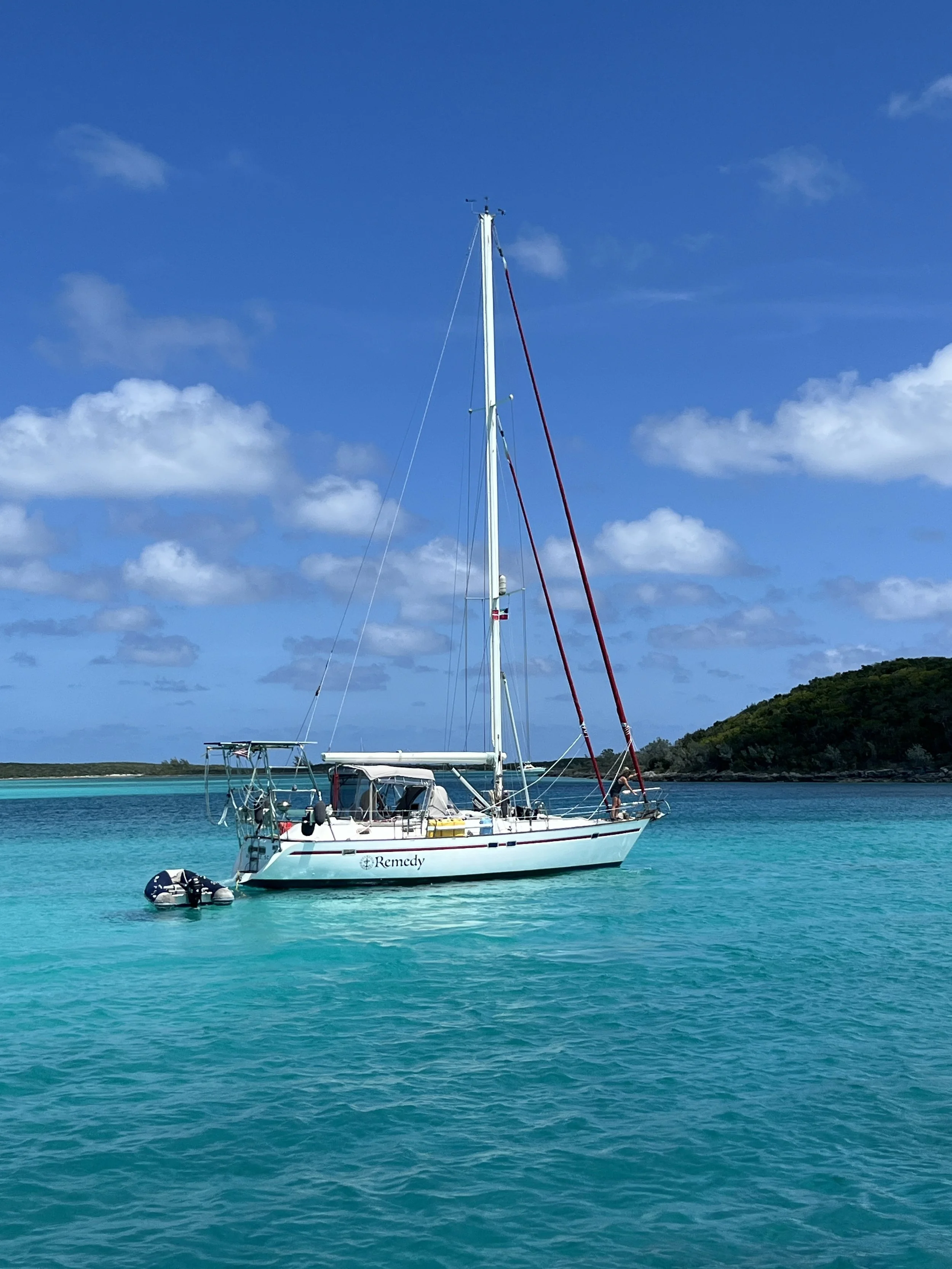 After clearing Immigration and Customs, we docked for a couple of days to reset and provision before an overnight sail down to the Berry Islands. The Berry Islands are secluded and beautiful. We didn't waste any time—our first adventure was snorkeling a sunken barge, where our friend LJ gave me what would prove to be a very valuable lesson about what to do if I ever saw a shark. The east side of the islands offered crystal clear blue water as far as the eye could see. Our six-and-a-half-foot keel makes navigating the shallower waters of the Bahamas tricky, but doable. For one particularly stunning anchorage, we followed Addison Chan's waypoints and made it in with barely an inch under the keel—the view was well worth every anxious moment.