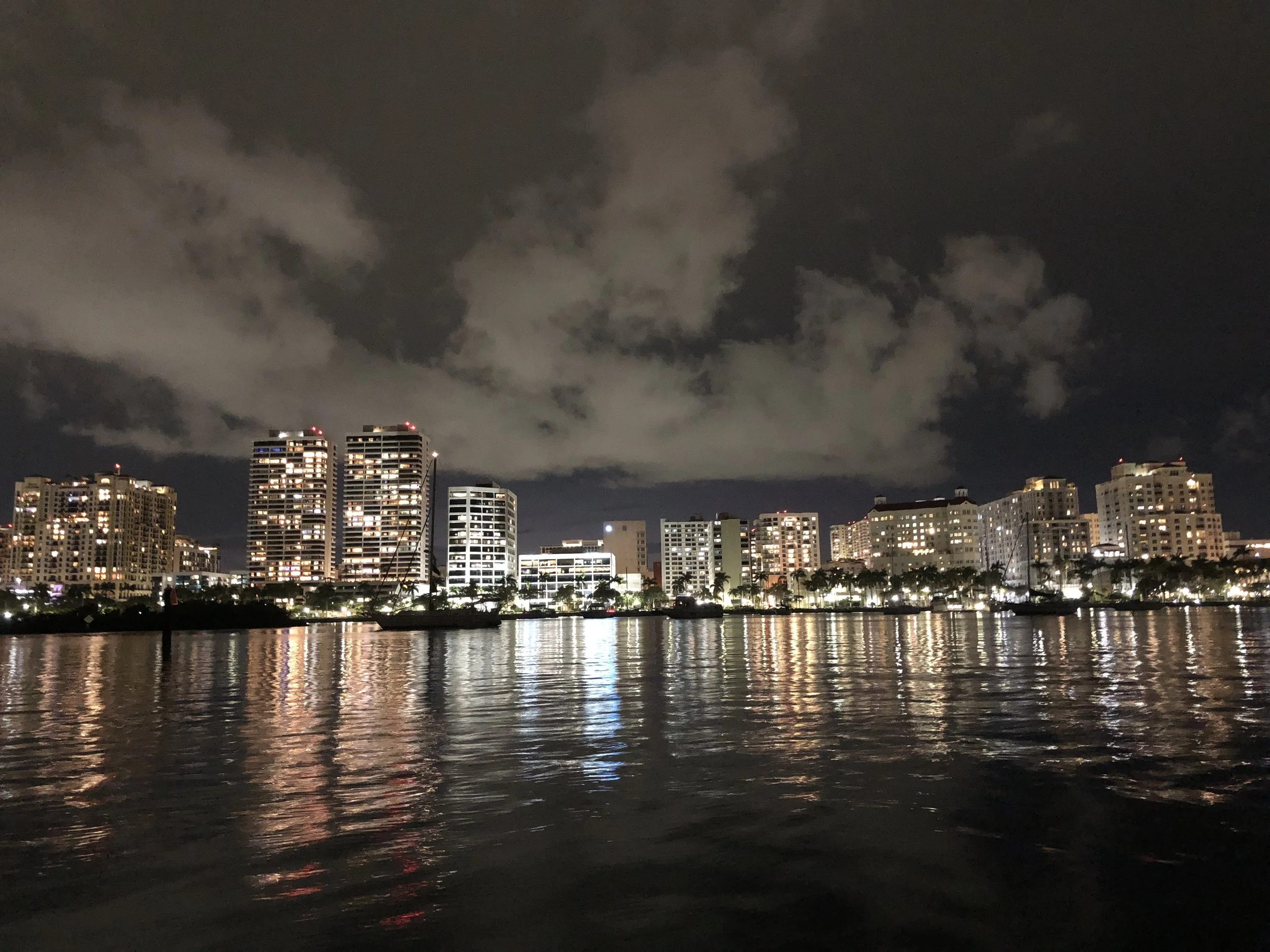 After three weeks, it was time to move on to West Palm Beach, where we would wait for a weather window to cross to the Bahamas. We were among a fleet of four Brunswick Landing Dock 7 boats anchored within a half-mile of one another, right in the heart of downtown.